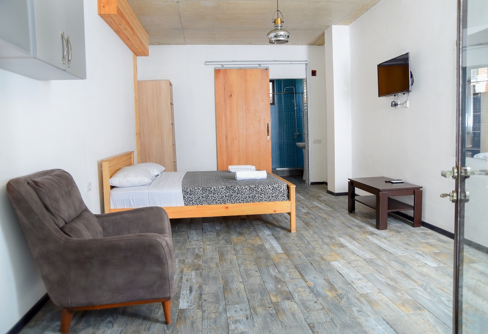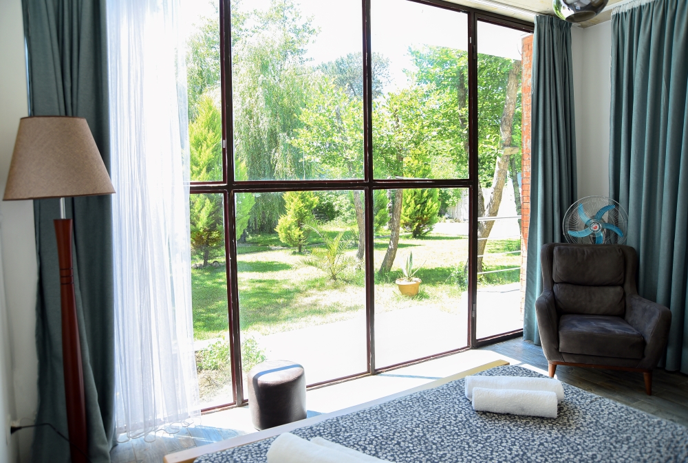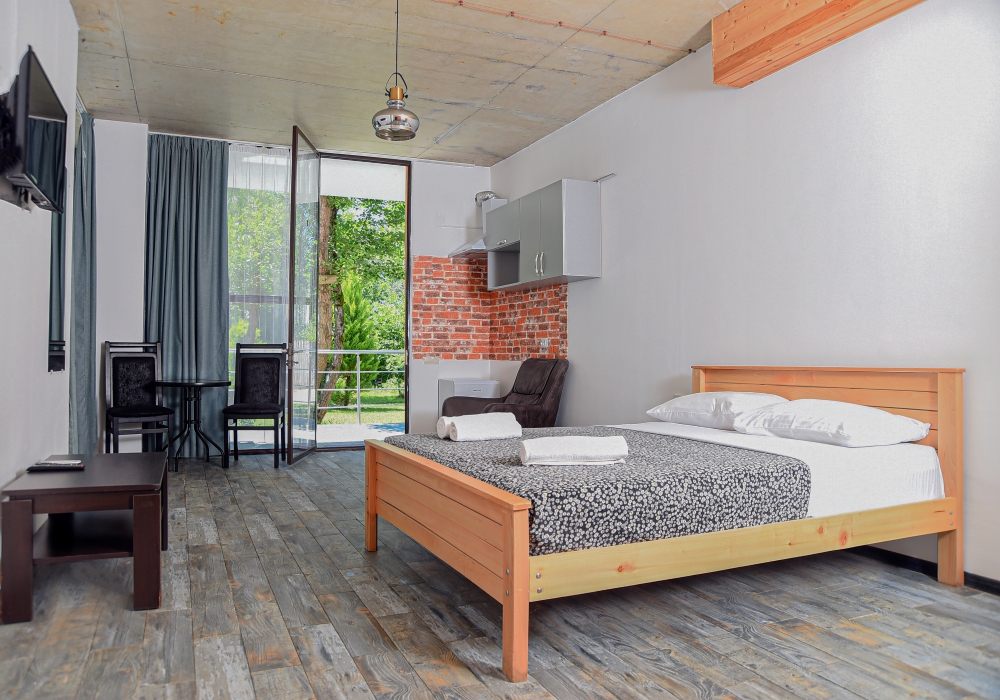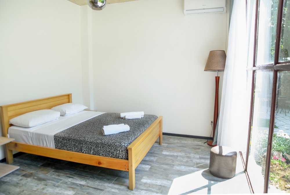 At 50sq m the Deluxe Quadruple room with two bedrooms on the ground floor feature two double beds, coffee table and 2 chairs, open cupboard, air-conditioner, TV, as well as a private yard. The flooring extends into the bathroom, which are fitted with rainfall showers.